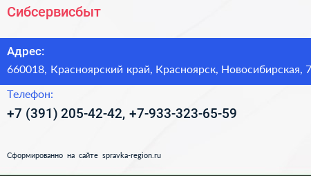 Сибсервисбыт по адресу 660018, Красноярский край, Красноярск, Новосибирская, 7 в дальнейшем Организация, размещена в следующих категориях: