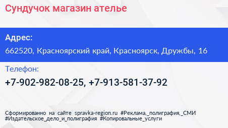 Сундучок, магазин-ателье по адресу 662520, Красноярский край, Красноярск, Дружбы, 16 в дальнейшем Организация, размещена в следующих категориях: