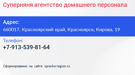 Суперняня, агентство домашнего персонала по адресу 660017, Красноярский край, Красноярск, Кирова, 19 в дальнейшем Организация, размещена в следующих категориях: