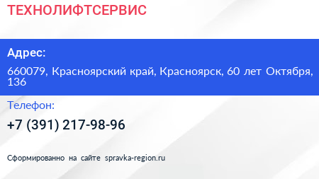ТЕХНОЛИФТСЕРВИС по адресу 660079, Красноярский край, Красноярск, 60 лет Октября, 136 в дальнейшем Организация, размещена в следующих категориях:
