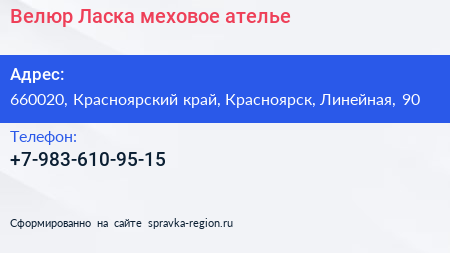 Велюр & Ласка, меховое ателье по адресу 660020, Красноярский край, Красноярск, Линейная, 90 в дальнейшем Организация, размещена в следующих категориях: