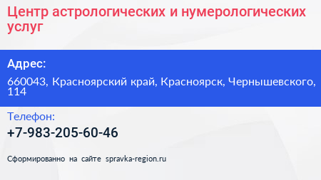 Центр астрологических и нумерологических услуг по адресу 660043, Красноярский край, Красноярск, Чернышевского, 114 в дальнейшем Организация, размещена в следующих категориях: