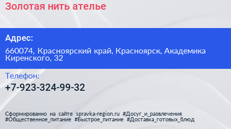 Золотая нить, ателье по адресу 660074, Красноярский край, Красноярск, Академика Киренского, 32 в дальнейшем Организация, размещена в следующих категориях:
