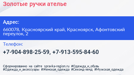 Золотые ручки, ателье по адресу 660078, Красноярский край, Красноярск, Афонтовский переулок, 2 в дальнейшем Организация, размещена в следующих категориях: