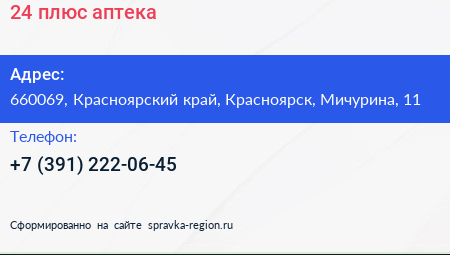 24 плюс, аптека по адресу 660069, Красноярский край, Красноярск, Мичурина, 11 в дальнейшем Организация, размещена в следующих категориях: