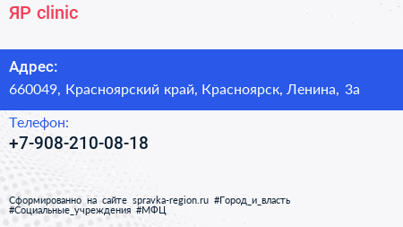 ЯР clinic по адресу 660049, Красноярский край, Красноярск, Ленина, 3а в дальнейшем Организация, размещена в следующих категориях: