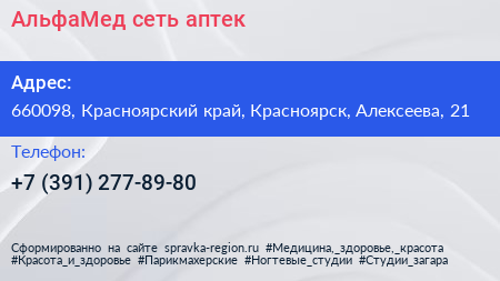 АльфаМед, сеть аптек по адресу 660098, Красноярский край, Красноярск, Алексеева, 21 в дальнейшем Организация, размещена в следующих категориях: