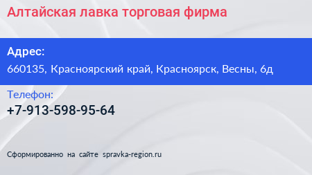Алтайская лавка, торговая фирма по адресу 660135, Красноярский край, Красноярск, Весны, 6д в дальнейшем Организация, размещена в следующих категориях: