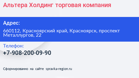 Альтера Холдинг, торговая компания по адресу 660112, Красноярский край, Красноярск, проспект Металлургов, 22 в дальнейшем Организация, размещена в следующих категориях: