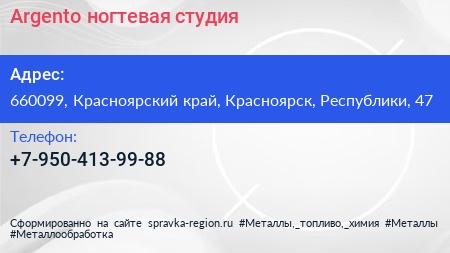 Argento, ногтевая студия по адресу 660099, Красноярский край, Красноярск, Республики, 47 в дальнейшем Организация, размещена в следующих категориях: