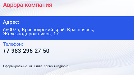 Аврора, компания по адресу 660075, Красноярский край, Красноярск, Железнодорожников, 17 в дальнейшем Организация, размещена в следующих категориях: