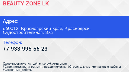 BEAUTY ZONE LK по адресу 660012, Красноярский край, Красноярск, Судостроительная, 37а в дальнейшем Организация, размещена в следующих категориях: