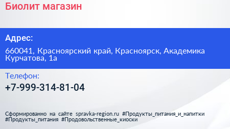 Биолит, магазин по адресу 660041, Красноярский край, Красноярск, Академика Курчатова, 1а в дальнейшем Организация, размещена в следующих категориях: