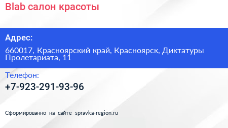 Blab, салон красоты по адресу 660017, Красноярский край, Красноярск, Диктатуры Пролетариата, 11 в дальнейшем Организация, размещена в следующих категориях: