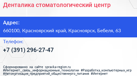 Денталика, стоматологический центр по адресу 660100, Красноярский край, Красноярск, Бебеля, 63 в дальнейшем Организация, размещена в следующих категориях: