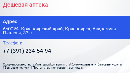 Дешевая аптека по адресу 660094, Красноярский край, Красноярск, Академика Павлова, 33ж в дальнейшем Организация, размещена в следующих категориях: