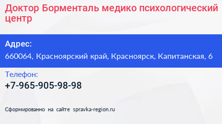 Доктор Борменталь, медико-психологический центр по адресу 660064, Красноярский край, Красноярск, Капитанская, 6 в дальнейшем Организация, размещена в следующих категориях: