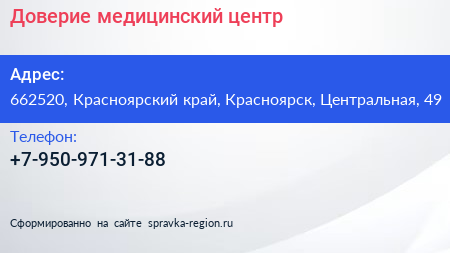 Доверие, медицинский центр по адресу 662520, Красноярский край, Красноярск, Центральная, 49 в дальнейшем Организация, размещена в следующих категориях: