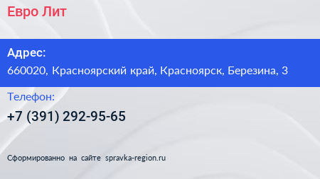 Евро-Лит по адресу 660020, Красноярский край, Красноярск, Березина, 3 в дальнейшем Организация, размещена в следующих категориях: