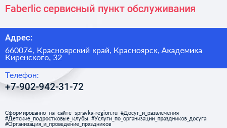 Faberlic, сервисный пункт обслуживания по адресу 660074, Красноярский край, Красноярск, Академика Киренского, 32 в дальнейшем Организация, размещена в следующих категориях: