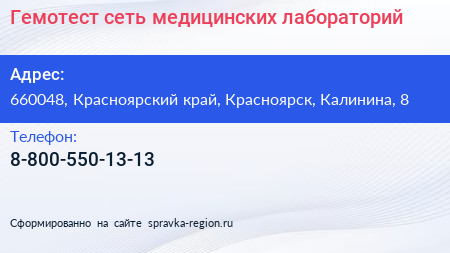 Гемотест, сеть медицинских лабораторий по адресу 660048, Красноярский край, Красноярск, Калинина, 8 в дальнейшем Организация, размещена в следующих категориях: