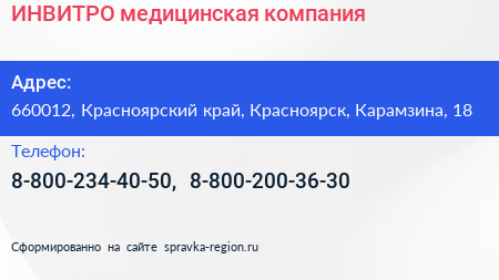 ИНВИТРО, медицинская компания по адресу 660012, Красноярский край, Красноярск, Карамзина, 18 в дальнейшем Организация, размещена в следующих категориях: