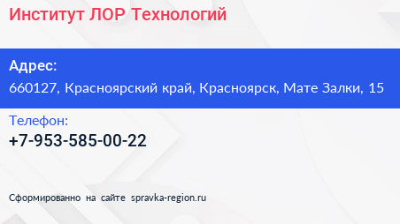 Институт ЛОР-Технологий по адресу 660127, Красноярский край, Красноярск, Мате Залки, 15 в дальнейшем Организация, размещена в следующих категориях: