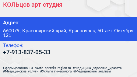 КОЛЬцов, арт-студия по адресу 660079, Красноярский край, Красноярск, 60 лет Октября, 121 в дальнейшем Организация, размещена в следующих категориях: