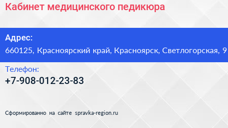 Кабинет медицинского педикюра по адресу 660125, Красноярский край, Красноярск, Светлогорская, 9 в дальнейшем Организация, размещена в следующих категориях: