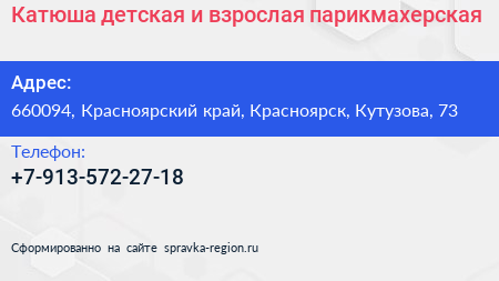 Катюша, детская и взрослая парикмахерская по адресу 660094, Красноярский край, Красноярск, Кутузова, 73 в дальнейшем Организация, размещена в следующих категориях: