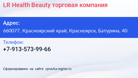 LR Health & Beauty, торговая компания по адресу 660077, Красноярский край, Красноярск, Батурина, 40 в дальнейшем Организация, размещена в следующих категориях: