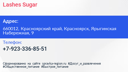 Lashes & Sugar по адресу 660012, Красноярский край, Красноярск, Ярыгинская Набережная, 9 в дальнейшем Организация, размещена в следующих категориях: