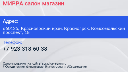МИРРА, салон-магазин по адресу 660125, Красноярский край, Красноярск, Комсомольский проспект, 18 в дальнейшем Организация, размещена в следующих категориях: