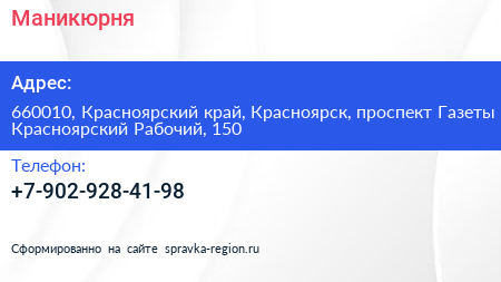 Маникюрня по адресу 660010, Красноярский край, Красноярск, проспект Газеты Красноярский Рабочий, 150 в дальнейшем Организация, размещена в следующих категориях: