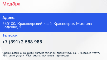 МедЭра по адресу 660100, Красноярский край, Красноярск, Михаила Годенко, 1 в дальнейшем Организация, размещена в следующих категориях: