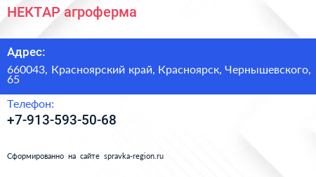 НЕКТАР, агроферма по адресу 660043, Красноярский край, Красноярск, Чернышевского, 65 в дальнейшем Организация, размещена в следующих категориях: