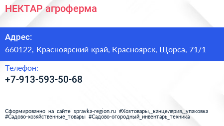 НЕКТАР, агроферма по адресу 660122, Красноярский край, Красноярск, Щорса, 71/1 в дальнейшем Организация, размещена в следующих категориях: