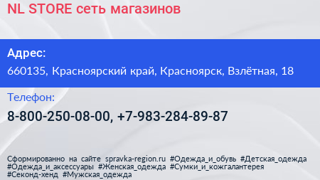 NL STORE, сеть магазинов по адресу 660135, Красноярский край, Красноярск, Взлётная, 18 в дальнейшем Организация, размещена в следующих категориях:
