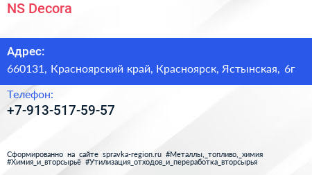NS Decora по адресу 660131, Красноярский край, Красноярск, Ястынская, 6г в дальнейшем Организация, размещена в следующих категориях: