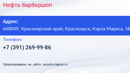 Нефть, барбершоп по адресу 660049, Красноярский край, Красноярск, Карла Маркса, 58 в дальнейшем Организация, размещена в следующих категориях:
