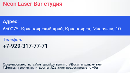 Neon Laser Bar, студия по адресу 660075, Красноярский край, Красноярск, Маерчака, 10 в дальнейшем Организация, размещена в следующих категориях: