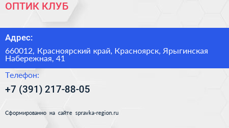 ОПТИК-КЛУБ по адресу 660012, Красноярский край, Красноярск, Ярыгинская Набережная, 41 в дальнейшем Организация, размещена в следующих категориях: