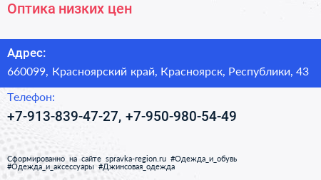 Оптика низких цен по адресу 660099, Красноярский край, Красноярск, Республики, 43 в дальнейшем Организация, размещена в следующих категориях: