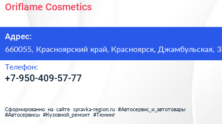 Oriflame Cosmetics по адресу 660055, Красноярский край, Красноярск, Джамбульская, 3 в дальнейшем Организация, размещена в следующих категориях: