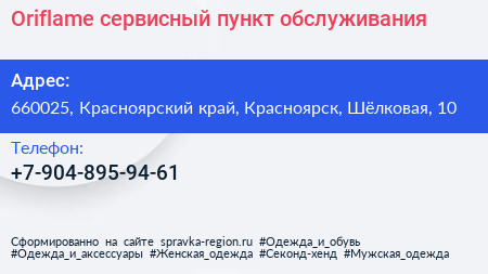Oriflame, сервисный пункт обслуживания по адресу 660025, Красноярский край, Красноярск, Шёлковая, 10 в дальнейшем Организация, размещена в следующих категориях: