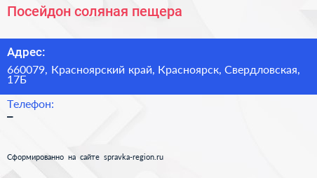 Посейдон, соляная пещера по адресу 660079, Красноярский край, Красноярск, Свердловская, 17Б в дальнейшем Организация, размещена в следующих категориях: