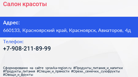 Салон красоты по адресу 660133, Красноярский край, Красноярск, Авиаторов, 4д в дальнейшем Организация, размещена в следующих категориях:
