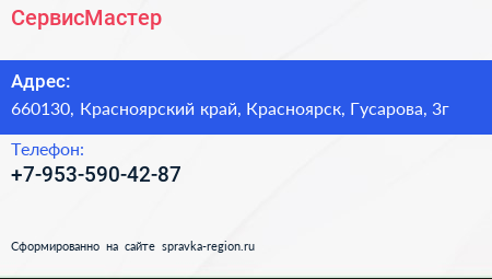 СервисМастер по адресу 660130, Красноярский край, Красноярск, Гусарова, 3г в дальнейшем Организация, размещена в следующих категориях: