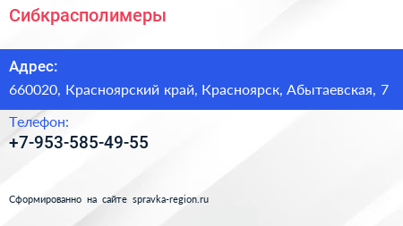 Сибкрасполимеры по адресу 660020, Красноярский край, Красноярск, Абытаевская, 7 в дальнейшем Организация, размещена в следующих категориях: