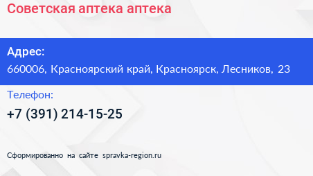 Советская аптека, аптека по адресу 660006, Красноярский край, Красноярск, Лесников, 23 в дальнейшем Организация, размещена в следующих категориях: